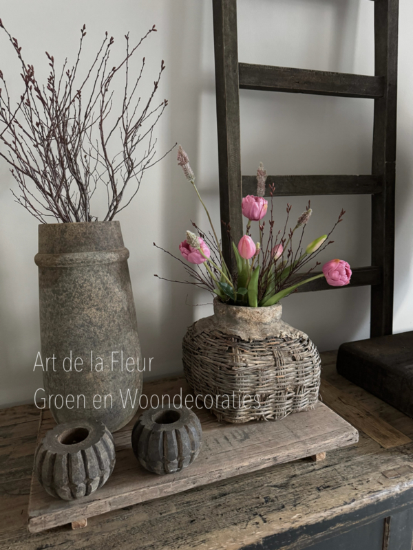 Landelijke pot met Gagel en Tulpen incl deksel en decoratieLandelijke pot met Gagel en Tulpen incl deksel en decoratie